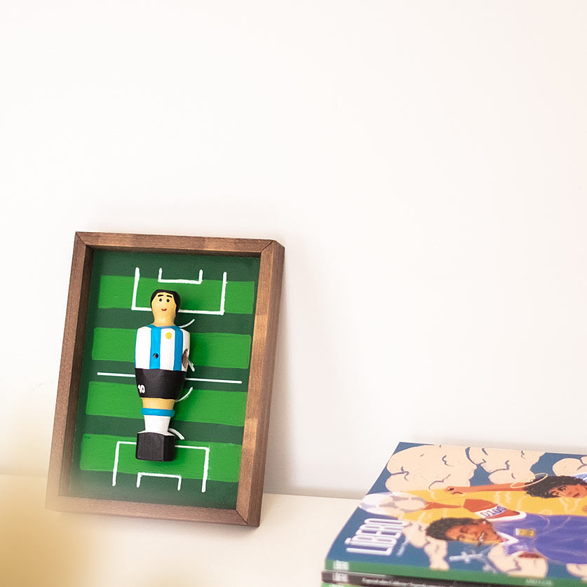 ¡Un regalo personalizado para todos los futboleros! Jugador de futbolín enmarcado en marco de madera, fabricado y pintado a mano en España. Colócalo en el mejor lugar de tu hogar. Para los nostálgicos y futboleros. Elige entre los equipos de primera, los jugadores de leyenda o hazlo personalizado con el equipo que nos pidas. Lo hacemos a tu medida. Un recuerdo original hecho de forma artesanal en nuestro taller.